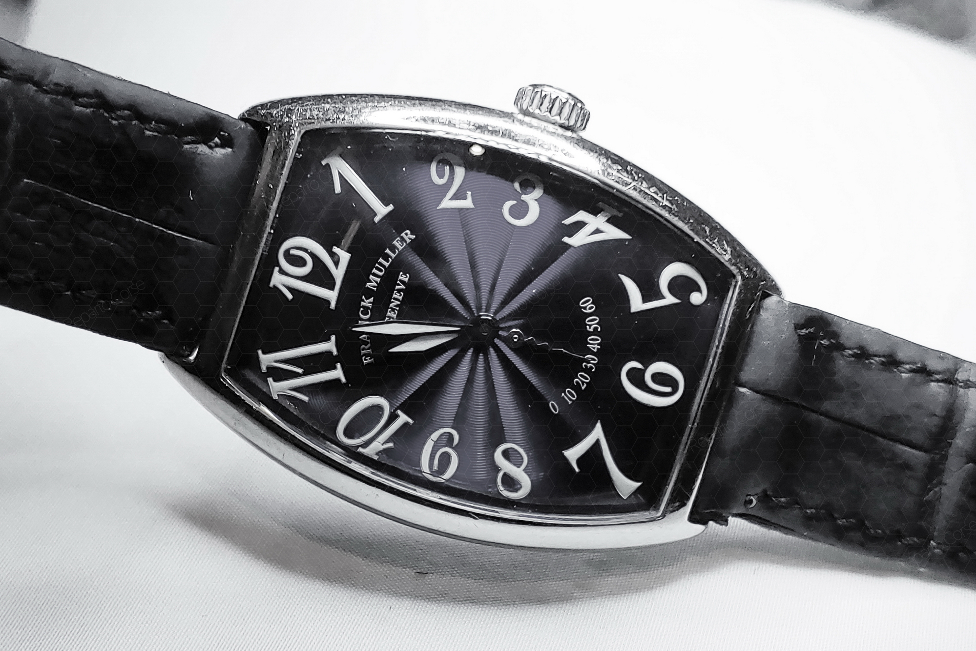 시계를 받아보니 케이스는 온통 스크래치 투성, 백을 고정하는 네 개의 나사 중 하나는 제 것이 아니고 빨갛게 녹슬었다. 다이얼은 양 측면에 크랙이 갔고 아무리 봐도 이건 전투용으로 막 사용한 시계 같은데. 하지만 프랭크 뮬러 특유의 레트로그레이드 세컨드, 0에서 60초까지 쭉 가다가 마지막에 다시 0으로 점프하는 방식의 초침이 적용되었다.